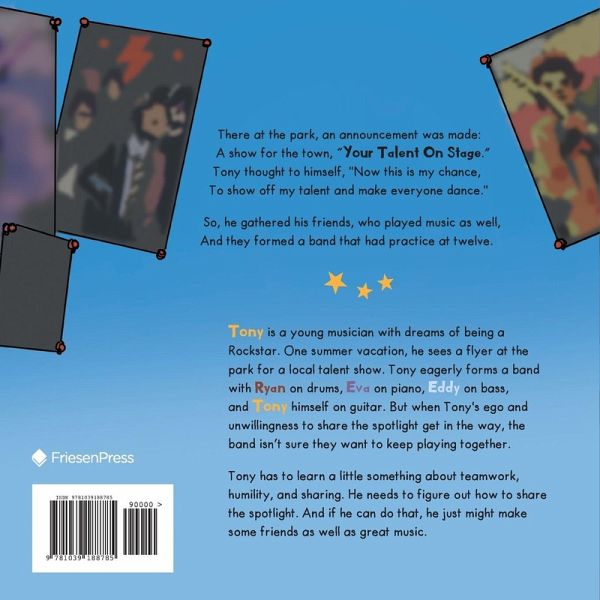 There at the park, an announcement was made: A show for the town, "Your Talent On Stage." Tony thought to himself, "Now this is my chance, To show off my talent and make everyone dance." So, he gathered his friends, who played music as well, And they formed a band that had practice at twelve. Tony is a young musician with dreams of being a Rockstar. One summer vacation, he sees a flyer at the park for a local talent show. Tony eagerly forms a band with Ryan on drums, Eva on piano, Eddy on bass, and Tony himself on guitar. But when Tony's ego and unwillingness to share the spotlight get in the…mehr