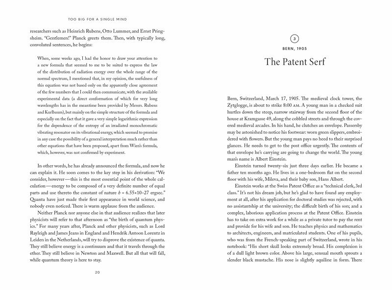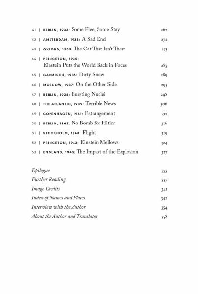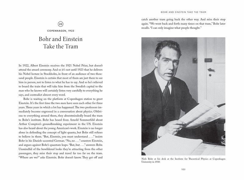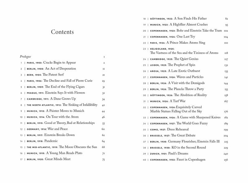 Paris, 1903: Cracks begin to appear Berlin, 1900: An act of desperation Bern, 1905: The patent serf Paris, 1906: The decline and fall of Pierre Curie Berlin, 1908: The end of the flying cigars Prague, 1911: Einstein says it with flowers Cambridge, 1911: A Dane grows up The North Atlantic, 1912: The sinking of infallibility Munich, 1913: A painter moves to Munich Munich, 1914: On tour with the atom Berlin, 1915: Good at theory, bad at relationships Germany, 1916: War and peace Berlin, 1917: Einstein breaks down Berlin, 1918: Pandemic The Caribbean, 1919: The moon obscures the sun Munich, 1919: A young man reads Plato Berlin, 1920: Great minds meet Göttingen, 1922: A son finds his father Munich, 1923: A high-flier almost crashes Copenhagen, 1923: Bohr and Einstein take the tram Copenhagen, 1924: One last try Paris, 1924: A prince makes atoms sing Heligoland, 1925: The vastness of the sea and the tininess of atoms Cambridge, 1925: The quiet genius Leiden, 1925: The prophet of spin Arosa, 1925: A late erotic outburst Copenhagen, 1926: Waves and particles Berlin, 1926: A visit with the demigods Berlin, 1926: The Plancks throw a party Göttingen, 1926: The abolition of reality Munich, 1926: A turf war Copenhagen, 1926: Exquisitely carved marble statues falling out of the sky Copenhagen, 1926: A game with sharpened knives Copenhagen, 1927: The world goes fuzzy Como, 1927: Dress rehearsal Brussels, 1927: The great debate Berlin, 1930: Germany flourishes, Einstein falls ill Brussels, 1930: K.O. in the second round Zurich, 1931: Pauli’s dreams Copenhagen, 1932: Faust in Copenhagen Berlin, 1933: Some flee, some stay Amsterdam, 1933: A sad end Oxford, 1935: The cat that isn’t there Princeton, 1935: Einstein puts the world back in focus Garmisch, 1935: Dirty snow Moscow, 1937: On the other side Berlin, 1938: Bursting nuclei The Atlantic, 1939: Terrible news Copenhagen, 1941: Estrangement Berlin, 1942: No bomb for Hitler Stockholm, 1943: Flight Princeton, 1943: Einstein mellows England, 1945: The impact of the explosion