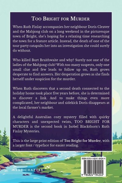 When Ruth Finlay accompanies her neighbour Doris Cleaver and the Mahjong club on a long weekend in the picturesque town of Bright, she's hoping for a relaxing time researching the town for a feature article. Instead, the death of one of the tour party catapults her into an investigation she could surely do without. Who killed Burt Braithwaite and why? Surely not one of the ladies of the Mahjong club? With too many suspects, only one small clue and few leads to follow up on, Ruth grows desperate to find answers. Her desperation grows as she finds herself under suspicion for the murder. When Ruth discovers that a second death connected to the holiday home took place five years before, she is determined to discover a link. And to make things even more complicated, her neighbour and sidekick Doris disappears at the local farmer's market. A delightful Australian cozy mystery filled with quirky characters and unexpected twists, TOO BRIGHT FOR MURDER is the second book in Isobel Blackthorn's Ruth Finlay Mysteries. This is the large print edition of Too Bright for Murder, with a larger font / typeface for easier reading.