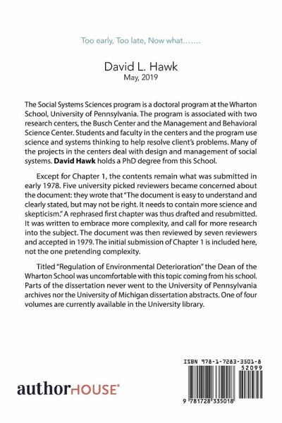Contents presented here are not intended to make humans feel good about themselves, nor their futures. It provides little support to business as usual in relations between humans and nature. Many depict this relation with metaphorical hope as in always seeing glasses as half-full. Others are more pessimistic and see glasses as half-empty. Neither will find comfort herein. The reality outlined herein is closer to a glass as empty, and covered with stains. While harsh, continuance of ever-expanding environmental deterioration promises to be much harsher. One consequence of deterioration is climate change as it emerged in 1977 near the end of a study presented in this book. Climate change was a proposed consequence of the way in which humans lived via ever expanding industrialization to meet growing human needs and exploding human wants. The study began with a focus on approaches to regulating industrialization pollution. Increasing legalistic regulation was then seen as the best means to control expanding deterioration of the environment, if and when the situation might become dire. Tougher laws and stricter governance were presumed to be available to protect the conditions necessary for life. The study was begun in 1975 while based at the Stockholm School of Economics, Institute of International Business. It was funded by corporate and governmental interests. It attracted leaders from the private and public sectors in several countries. Company selections were based on those who owned production facilities in several countries, facilities with similar technology making similar products resulting in similar pollution. In this way we could document pollution flows in order to evaluate differing governmental regulations. Results surprised all involved, including the researchers. The US was presumed to be very effective in environmental pollution regulations. Research results showed the opposite. It was found to rely too much on unknowledgeable lawyers and incomprehensible legalese all based on reductionist analysis in search of cause-effect logic. Significant success was instead found where the role of 2-dimensional paper laws was greatly restricted. Such was replaced by the authority of human self-governance pursuing 3-dimensional innovation with recognition of 4-dimensional limitations. Study results recommended replacing legal order with a negotiated order. This was thought to better track the systemic processes of deterioration, processes the analytic couldn't see. This was seen to have encouraged the needed business as unusual. Results were presented to OECD as part of their discussion of different approaches to managing environmental deterioration. Results were also presented in a dissertation for a PhD in Systems Sciences, Wharton School, University of Pennsylvania. Reviewers were concerned about two items. First was that environmental deterioration may be better understood via deeper analysis, not broader synthesis. Second was that climate change evolving from further environmental deterioration was speculative. It needed to be dropped. In addition, the Wharton dean of the time refused to approve the work. He did not see a relation between environmental deterioration and business, and he believed students needed to concentrate on business as usual before wondering off into the unusual. Since that time relations between man and nature have not improved, nor have relations between men and between men and themselves. We now face the ultimate of Joseph Heller's Catch-22 and Gregory Bateson's Double Bind. Business as usual will end in no business. The essence of the 1979 work was recently tested via posting a question on the Member Community Blog Site of the 120,000 member American Association for the Advancement of Science. The question was: Humans are changing the context for life on our planet to the negative. Does anyone see a source for hope? More than 800 responses were