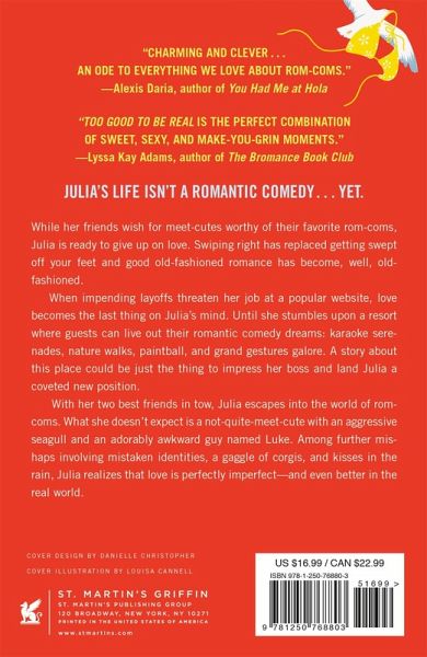 "The stuff of rom-com fantasies come to life." - Entertainment Weekly "The perfect combination of sweet, sexy, and make-you-grin moments." - Lyssa Kay Adams, author of The Bromance Book Club "An ode to everything we love about rom-coms." - Alexis Daria, author of You Had Me at Hola She plans to prove there's a dozen reasons why life isn't like a romantic comedy, only to discover the one reason it is... While her friends wish for meet cutes worthy of their favorite rom-coms, Julia is ready to give up on love. Swiping right has replaced getting swept off your feet and good old-fashioned romance has become, well, old-fashioned. A writer for a popular website, love becomes the last thing on her mind when impending layoffs threaten her job. As Julia searches for the ultimate pitch to impress her boss, she stumbles upon a resort offering guests a chance to live out their romantic comedy dreams. Real life dating is so bleak, who wouldn't want to spend a week in a fantasy rom-com world with your best friends? At the resort, Julia literally falls into a not-quite-meet-cute involving an aggressive seagull and an adorably awkward guy named Luke who is also participating in the rom-com experience. Julia hides the fact she is there to do a story, but Luke harbors a few secrets of his own. Among further encounters with thieving seagulls, a gaggle of corgis, kisses in the rain, and even a karaoke serenade, their feelings deepen quickly. But could their love be real when they haven't been honest about their true identities? Once the fantasy is over, can they have a relationship in the real world? In her trade paperback debut, Melonie Johnson brings her signature humor, sexy romance, and strong female friendships in this hilarious romantic comedy about finding perfectly imperfect love, Too Good to Be Real.
