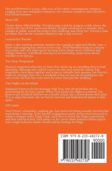 Hot and Bothered is a sexy collection of five short contemporary romance, ranging from two workplace romances, two reunion romances and a brother's best friend romance. Show Off On her thirty-fifth birthday, Veronica takes a risk by going to a club, where she catches the eye of her supervisor Rafael. Despite knowing it's a mistake, they indulge in public sexual encounters that challenge and excite her. Veronica risks her heart, but can she convince Rafael to take a risk on love? Lessons for Teacher Jamie, a shy teaching assistant, musters the courage to approach Brady Lane, a brave and outgoing war veteran in her class. Their flirtation leads to a steamy encounter, and each subsequent meeting leaves Jamie more confident and willing. However, with Brady leaving for an internship, Jamie must decide whether to let him go. Two Step Temptation Haven is surprised when her ex-lover Eric shows up at a wedding they're both attending. Although she's tried to move on, she can't resist his charm. Eric remembers their time together and wants to rekindle their passion, but Haven's walls are stronger than ever. A weekend of hot sex may be an indulgence she can't resist, but Eric has come back for more than just the wedding. Two Nights on the Island Nathaniel wants to fix his marriage with Tess, who divorced him due to prioritizing his air force career. When Tess misses her flight to a retreat, Nat plans to get stranded with her on a nearby island, but a storm derails their plan. Tess is angry but must rely on Nat for survival and finds herself drawn to him again. Off Limits Zach Purser, a boundary-pushing guy, has tried everything sexually but feels like something is missing. At his friend's engagement party, he becomes attracted to Adam's younger sister, Paige Clark. Zach tries to resist, but Paige is persistent, and they end up in bed. Zach panics as he's never done romance before and is now caught between Adam's wrath and his feelings for Paige.