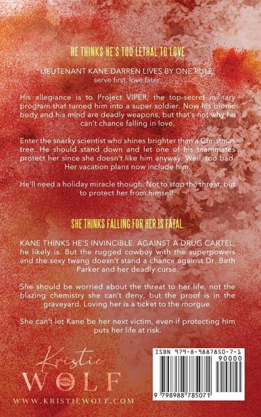 HE THINKS HE'S TOO LETHAL TO LOVE Lieutenant Kane Darren lives by one rule: serve first, love later. His allegiance is to Project VIPER, the top-secret military program that turned him into a super soldier. Now his bionic body and his mind are deadly weapons, but that's not why he can't chance falling in love. Enter the snarky scientist who shines brighter than a Christmas tree. He should stand down and let one of his teammates protect her since she doesn't like him anyway. Well, too bad. Her vacation plans now include him. He'll need a holiday miracle though. Not to stop the threat, but to protect her from himself. SHE THINKS FALLING FOR HER IS FATAL. Kane thinks he's invincible. Against a drug cartel, he likely is. But the rugged cowboy with the superpowers and the sexy twang doesn't stand a chance against Dr. Beth Parker and her deadly curse. She should be worried about the threat to her life, not the blazing chemistry she can't deny, but the proof is in the graveyard. Loving her is a ticket to the morgue. She can't let Kane be her next victim, even if protecting him puts her life at risk.