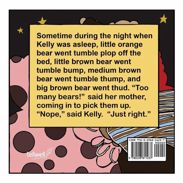 Sometime during the night when Kelly was asleep, little orange bear went tumble plop off the bed, little brown bear went tumble bump, medium brown bear went tumble thump, and big brown bear went thud. "Too many bears!" said her mother, coming in to pick them up. "Nope," said Kelly. "Just right."