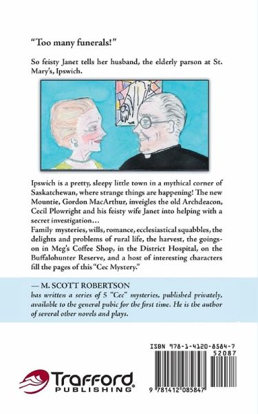 Archdeacon 'Cec' Plowright is a retired 're-tread,' as he calls himself, rector of St Mary's in the little town of Ipswich, Saskatchewan. After he is twitted by townspeople about 'too many funerals,' Constable Gordon MacArthur, RCMP, makes a surprising confession, which leads the two of them to find out just why all these deaths have occurred in a short time. They have the help of Cec's wife Janet and his adoring fan, Miss Carberry the librarian. Before the surprising conclusion the reader meets Pete Thackeray, troubled, headstrong rancher....Daniel Buffalohunter, the randy "altar boy"...Ma Davidson, owner of the Royal Cinema, who has her own secret...and a host of other characters and twists and turns of plot in this warm and witty portrayal of life in rural Saskatchewan.