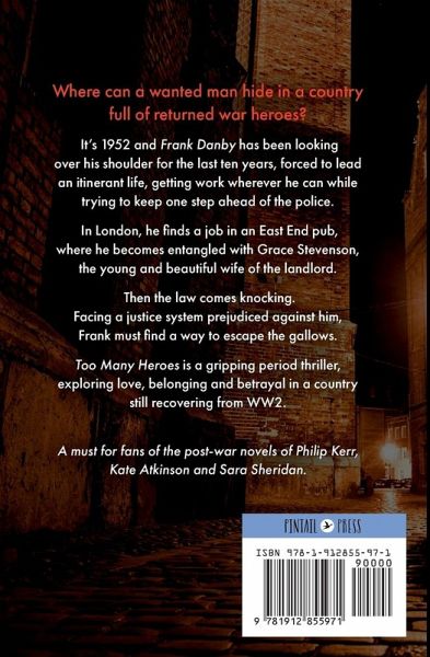 Where can a wanted man hide in a country full of returned war heroes? It’s 1952 and Frank Danby has been looking over his shoulder for the last ten years, forced to lead an itinerant life, getting work wherever he can while trying to keep one step ahead of the police. Returning to London, he finds a job in an East End pub, where he becomes entangled with Grace, the young and beautiful wife of the landlord. Then the law comes knocking. Facing a justice system prejudiced against him, Frank must find a way to escape the gallows Too Many Heroes is a gripping period thriller, exploring love, belonging and betrayal in a country still recovering from WW2.