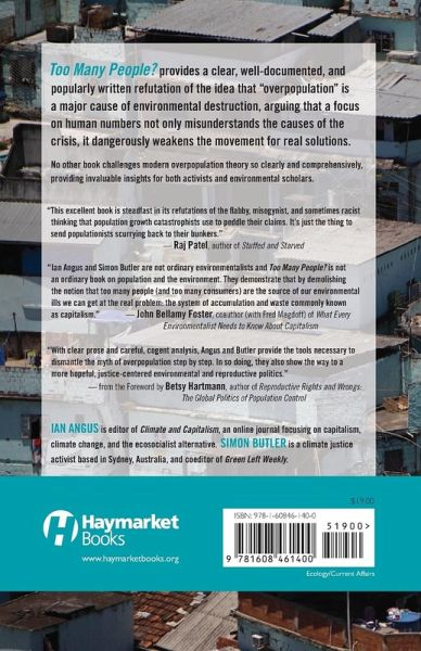 Introduction The Population Bomb is Back 1Are People the Problem? 2Varieties of Populationism Today The Failures of Populationism 3Dissecting those Overpopulation Numbers 4The Carrying Capacity Myth 5The Bomb That Didn't Explode 6Too Many Mouths to Feed? Control and Coercion 7The Dark History of 20th Century Population Control 8Non-Coercive Population Control? Greens versus Immigrants? 9Lifeboat Ethics 10Allies, Not Enemies Production, Consumption, and Revolution 11Too Many Consumers? 12The Myth of Consumer Sovereignty 13The Military-Corporate Polluter Complex 14A System of Growth and Waste 15Population Programs or Ecological Revolution? Appendices 1The Malthus Myth 2Eugene V. Debs on Immigration 3Donella Meadows on IPAT 4People's Agreement on Climate Change and the Rights of Mother Earth Bibliography Index