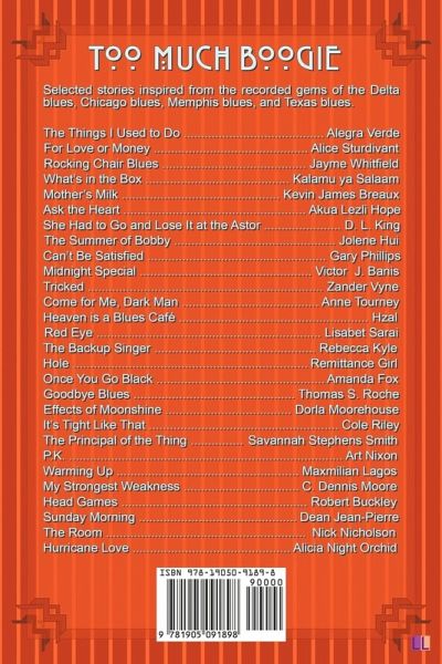 Selected stories inspired from the recorded gems of the Delta blues, Chicago blues, Memphis blues and Texas blues. Called "the Devil's music," the stories of the blues goes beyond jump turns, slow drag ditties, reel, jigs, minstrel songs, ragtime, or the buzzard lope. These lyrics connected to these stories celebrate heartache, separation, distrust, betrayal, lust, but they promise a healing love of revival and renewal. It's a celebration of the present, of the now, and it's totally mad at the past and suspicious of the future. But who are kidding? Let us tell the truth. Really, the themes of this raucous collection often wallow in carnal pain, in the weakness of the flesh, and the temptation of sin. Taboo love, forbidden love. Sometimes it's just plain nasty. All of the good stuff. In Too Much Boogie, the spirit of the blues afflicts everybody. Within the emotional pull of the lyrics and its stirring music, there is a common language of the heart and the soul. Although the blues were born and bred in the land of Jim Crow by black people, it has nothing to do with class, color, or category. Even the rich get the blues and do dumb things. The book shows there is a pulse beating within each of us and that pulse is the blues. 1. The Things I Used to Do by Alegra Verde 2. For Love or Money by Alice Sturdivant 3. Rocking Chair Blues by Jayme Whitfield 4. What's in the Box by Kalamu ya Salaam 5. Mother's Milk by Kevin James Breaux 6. Ask the Heart by Akua Lezli Hope 7. She Had to Go and Lose It at the Astor by D. L. King 8. The Summer of Bobby by Jolene Hui 9. Can't Be Satisfied by Gary Phillips 10. Midnight Special by Victor J. Banis 11. Tricked by Zander Vyne 12. Come for Me, Dark Man by Anne Tourney 13. Heaven is a Blues Café by Hzal 14. Red Eye by Lisabet Sarai 15. The Backup Singer by Rebecca Kyle 16. Hole by Remittance Girl 17. Once You Go Black by Amanda Fox 18. Goodbye Blues by Thomas S. Roche 19. Effects of Moonshine by Dorla Moorehouse 20. It's Tight Like That by Cole Riley 21. The Principal of the Thing by Savannah Stephens Smith 22. P.K. by Art Nixon 23. Warming Up by Maxmilian Lagos 24. My Strongest Weakness by C. Dennis Moore 25. Head Games by Robert Buckley 26. Sunday Morning by Dean Jean-Pierre 27. The Room by Nick Nicholson 28. Hurricane Love by Alicia Night Orchid