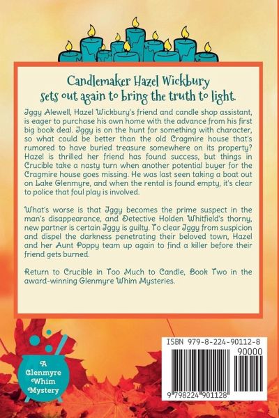 Candlemaker Hazel Wickbury sets out again to bring the truth to light. Iggy Alewell, Hazel Wickbury's friend and candle shop assistant, is eager to purchase his own home with the advance from his first big book deal. Iggy is on the hunt for something with character, so what could be better than the old Cragmire house that's rumored to have buried treasure somewhere on its property? Hazel is thrilled her friend has found success, but things in Crucible take a nasty turn when another potential buyer for the Cragmire house goes missing. He was last seen taking a boat out on Lake Glenmyre, and when the rental is found empty, it's clear to police that foul play is involved. What's worse is that Iggy becomes the prime suspect in the man's disappearance, and Detective Holden Whitfield's thorny, new partner is certain Iggy is guilty. To clear Iggy from suspicion and dispel the darkness penetrating their beloved town, Hazel and her Aunt Poppy team up again to find a killer before their friend gets burned. Return to Crucible in Too Much to Candle, Book Two in the award-winning Glenmyre Whim Mysteries. Praise for You Can't Candle the Truth, Book One in the Glenmyre Whim Mysteries: "You Can't Candle the Truth, like its heroine, Hazel Wickbury, is absolutely enchanting...magic is threaded with persuasive charm into the fabric of the story." -- Lori Robbins, award-winning author of the On Pointe Mysteries "a unique, charming, feel-good story that fans across the entire mystery spectrum will enjoy." -- J.C. Kenney, bestselling author of the Allie Cobb Mysteries "With the setting, characters, and mystery storyline all on point, You Can't Candle the Truth is pure delight." -- Carol E. Ayer, author of The HSP Mysteries