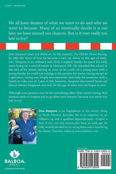 We all have dreams of what we want to do and who we want to become. Many of us eventually decide it is too late; we have missed our chances. But is it ever really too late to try? Don Simpson does not think so. In his memoir, Too Old for Motor Racing, he tells the story of how he became a race car driver at the age of sixty-two. Simpson is an ordinary man from a regular family; he spent his early years living on a council estate in Liverpool, UK. He attended the school at the end of his street, leaving as soon as he could. As a young man with a young family, he could not indulge in his passion for motor racing except as a spectator; racing was simply too expensive and risky for someone with a family to take care of. Later in life, however, Simpson discovered limits are almost always imagined, not real. At the age of sixty-two, he began to race. Although your passion may be for something other than motor racing, this memoir seeks to inspire you to go after your dreams, because it is never too late to try.