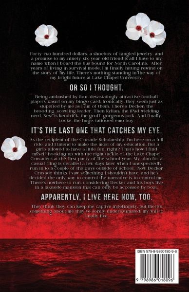 Never let them get you to the second location. Even if that location happens to be a lakeside mansion home to four hot-as-sin men. After years of living in survival mode, I'm finally hitting rewind on the story of my life. There's nothing standing in the way of my bright future at Lake Chapel University. Or so I thought. Being ambushed by four devastatingly attractive football players wasn't on my bingo card. Ironically, they seem just as stupefied by me as I am of them. There's Decker: the brooding, scowling leader. Then Kylian: the iPad-wielding nerd. Next is Kendrick: the gruff, gorgeous jock. And finally, Locke: the huge, tattooed emo boy. It's the last one that catches my eye. As the recipient of the Crusade Scholarship, I'm here on a full ride, and I intend to make the most of my education. But a girl's allowed to have a little fun, right? That's how I find myself hooking up with the right guard of the Lake Chapel Crusaders at the first party of the school year. My plan for a casual fling is derailed a few days later when I unexpectedly run in to a couple of the guys outside of school. Now Decker Crusade thinks I saw something I shouldn't have, and he's decided the only way to control the narrative is to control me. There's nowhere to run, considering Decker and his boys live in a lakeside mansion that can only be accessed by boat. Apparently, I live here now, too. They think they can keep me captive indefinitely, but there's something about me they've sorely underestimated: my will to finally live.