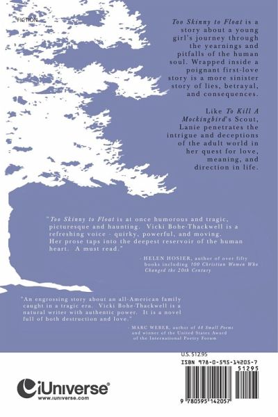 Too Skinny to Float is a story about a young girl's journey through the yearnings and pitfalls of the human soul. Wrapped inside a poignant first-love story of lies, betrayal, and consequences. Like To Kill a Mockingbird's Scout, Lanie penetrates the intrigue and deceptions of the adult world in her quest for love, meaning, and direction in her life.