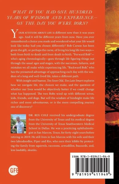 American Fiction Awards Finalist in General Fiction What if you had one hundred years of wisdom and experience-on the day you were born? Your attitude about life is different now than it was years ago. And it will be different years from now. Have you ever remembered a choice you made and wondered what your life would look like today had you chosen differently? Bob Carson has been given the gift, or perhaps the curse, of living his long life two ways-both from birth to death and from death to birth. "Forward Bob"-who's aging chronologically-goes through life figuring things out through the usual ages and stages, with the successes, failures, and mistakes we all make while experiencing life. "Backward Bob," who has the presumed advantage of approaching each day with the wisdom of a long and well-lived life, takes a different path. With insight and humor, Too Soon Old, Too Late Smart explores how we navigate life, the choices we make, and the question of whether our lives would be objectively better if we could change what has happened. The two Bobs wind up with different wives, kids, friends, and dogs. But will the wisdom of hindsight make life richer and more adventurous, or is the more compelling journey one of discovery?
