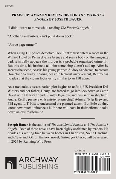 PRAISE BY AMAZON REVIEWERS FOR THE PATRIOT'S ANGELS BY JOSEPH BAUER "I didn't want to move while reading The Patriot's Angels" "Another gangbusters, can't put it down book." "A true page turner." When aging DC police detective Jack Renfro first enters a room in the Willard Hotel on Pennsylvania Avenue and sees a body on the king-size bed, it initially appears the murder is a probable organized crime hit. But this time, his instincts tell him something doesn't add up. After he secures the scene, he asks his young partner, Audrey Sanderson, to contact Homeland Security. Fearing possible terrorist involvement, Renfro has no idea that the victim looks eerily similar to an FBI agent. As a meticulous assassination plot begins to unfold, US President Del Winters and her father, Henry, are forced to go into lockdown at Camp David with Henry's friend, Stanley Bigelow, and his German shepherd, Augie. Renfro partners with anti-terrorism chief, Admiral Tyler Brew and FBI agent, L.T. Kitt to understand the planned attack. But little do they know how much influence a K-9 hero will have in their efforts to take down an evil mastermind.