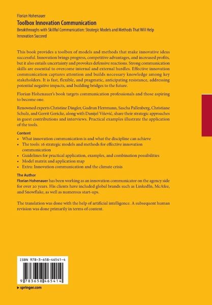 This book offers a toolbox of models and methods that make innovative ideas successful. Innovation brings progress, competitive advantages, and increases profits. However, innovation also always entails uncertainty and provokes defensive reactions, which is why strong communication skills are needed to overcome internal and external hurdles. Successful innovation communication creates awareness and builds necessary knowledge among all key stakeholders. It is fast, flexible, and pragmatic, anticipates resistance, addresses possible negative impacts, and builds bridges to the future.