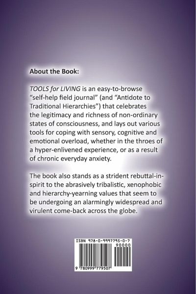 TOOLS for LIVING is an easy-to-browse "self-help field journal" that celebrates the legitimacy and richness of non-ordinary states of consciousness, and lays out various tools for coping with sensory, cognitive and emotional overload, whether in the throes of a hyper-enlivened experience, or as a result of chronic everyday anxiety. The book also stands as a strident rebuttal-in-spirit to the abrasively tribalistic, xenophobic and hierarchy-yearning values that seem to be undergoing an alarmingly widespread and virulent come-back across the globe.