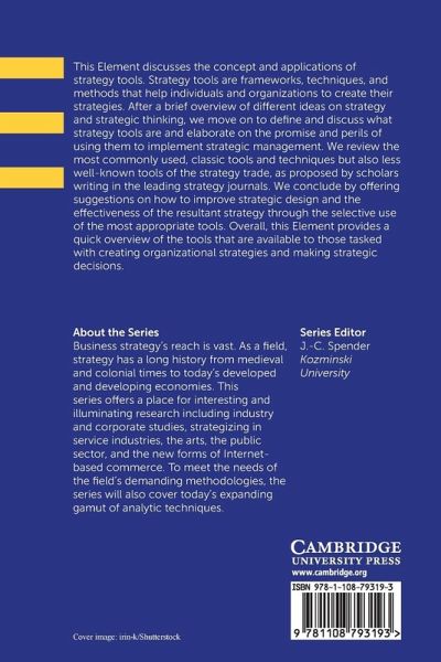 This Element discusses the concept and applications of strategy tools. These are frameworks, techniques, and methods that help individuals and organizations to create their strategies. The authors elaborate on the promise and perils of both commonly used and less well-known strategy tools to implement strategic management.