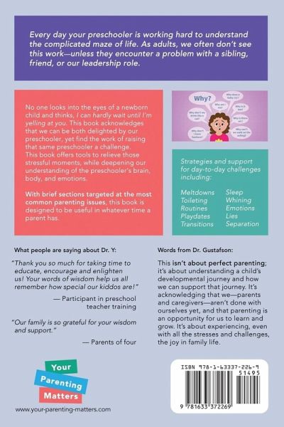 No one looks into the eyes of a newborn child and thinks, I can hardly wait until I’m yelling at you. This book acknowledges that we can be both delighted by our preschooler, yet find the work of raising that same preschooler a challenge. This book offers tools to relieve those stressful moments, while deepening our understanding of the preschooler’s brain, body, and emotions. With brief sections targeted at the most common parenting issues, this book is designed to be useful in whatever time a parent has.