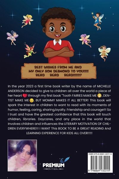 In the year 2023 a first time book writer by the name of MICHELLE ANDERSON decided to give to children all over the world a piece of her heart ¿¿ through my first book "Tooth FAIRIES MAKE ME ¿¿¿¿, DENTIST MAKE ME ¿¿, BUT MOMMY MAKES IT ALL BETTER! This book will spark the interest in children to want to read with its moments of humor, feeling, caring, sharing,loyalty. Friendship and courage!!! So I trust and have the greatest confidence that this book will touch children, libraries. Daycares, and any place in the world that Involves children and influences the LITERARY MOTIVATION OF CHILDREN EVERYWHERE!!! I WANT This BOOK TO BE A GREAT READING And LEARNING EXPERIENCE FOR KIDS ALL OVER!!!!! BEST WISHES FROM ME AND MY ONLY SON DESMOND TO YOU!!!!! READ READ READ!!!!!!!?