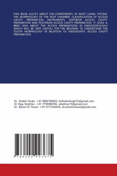 THIS BOOK ELICITS ABOUT THE COMPONENTS OF ROOT CANAL SYSTEM, THE MORPHOLOGY OF THE PULP CHAMBER, CLASSIFICATION OF ACCESS CAVITY, PREPARATION INSTRUMENTS, ANTERIOR ACCESS CAVITY PREPARATION AND POSTERIOR ACCESS CAVITY PREPARATION. IT GIVES A BRIEF IDEA ABOUT THE ACCESS PREPARATIONS IN ENDODONTOLOGY WHICH WILL BE VERY USEFULL FOR THE BEGINERS TO UNDERSTAND THE TOOTH MORPHOLOGY IN RELATION TO ENDODONTIC ACCESS CAVITY PREPARATION.