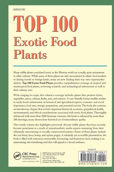 Many edible plants considered exotic in the Western world are actually quite mainstream in other cultures. While some of these plants are only encountered in ethnic food markets or during travels to foreign lands, many are now finding their way onto supermarket shelves. Top 100 Exotic Food Plants provides comprehensive coverage of tropical and semitropical food plants, reviewing scientific and technological information as well as their culinary uses. Wide-ranging in scope, this volume's coverage includes plants that produce fruits, vegetables, spices, culinary herbs, nuts, and extracts. A user-friendly format enables readers to easily locate information on botanical and agricultural aspects, economic and social importance, food uses, storage, preparation, and potential toxicity. The book also contains an introductory chapter that reviews important historical, economic, geopolitical, health, environmental, and ethical considerations associated with exotic food plants. Thoroughly referenced with more than 2000 literature citations, this book is enhanced by more than 200 drawings, many chosen from historical art of extraordinary quality. This timely volume also highlights previously obscure edible plants that have recently become prominent as a result of sensationalistic media reports stemming from their inherently entertaining or socially controversial natures. Some of these plants include the acai berry, kava, hemp, and opium poppy. A scholarly yet accessible presentation, the book is filled with numerous memorable, fascinating, and humorous facts, making it an entertaining and stimulating read that will appeal to a broad audience.