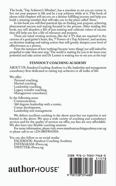 The book, 'Top Achiever's Mindset', has a mandate to set you on course to live out your purpose in life and be a top achiever while at it. This book of eleven solid chapters will set you on a destiny fulfilling journey and help you build a winning mindset that will take you to the place called 'there.' In this book you will find practical tips on finding your purpose, achieving phenomenal success and staying focused in the process. After reading this book, you will abandon a life of just existing and cultivate values of success that will help you live a life of relevance and purpose. There are mind riveting sections, like the 4 'P's that are required in the canvass of a goal getter's heart, the, '7 Powers of a Top Achiever', and sections on decision making and taking action that will greatly sharpen your level of effectiveness as a person. From the instances of how 'nothings' became 'some things' you will indeed be propelled to take 'that next step.' The world is waiting for you to let loose your potential and take action and Dr Lennie is waiting too to see you at the top! STANDOUT COACHING ACADEMY ABOUT US: Standout Coaching Academy is a life, leadership and management consultancy firm dedicated to raising top achievers in all walks of life. We offer: ¿ Personal coaching, ¿ Marital coaching, ¿ Leadership coaching, ¿ Legacy transfer coaching, ¿ Management consultancy In the following areas: ¿ Communication, ¿ 360 degrees leadership with a centre, ¿ Career development, ¿ Leadership and management. We deliver excellent coaching in the above areas but our expertise is not limited to the above. We span a wide variety of coaching and consultancy services and for the quality of services we offer, our fees are very affordable. We also have very flexible coaching sessions. For more information, please visit, www.standoutcoachingacademy.com.ng or please call us on +2348059043504. You can also follow us on social media: FACEBOOK: Standout Coaching Academy INSTAGRAM: @soca.ng TWITTER: @soca.ng