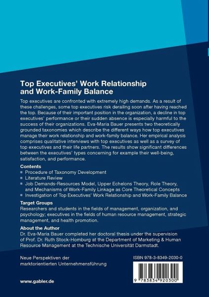 Top executives are confronted with extremely high demands. As a result of these challenges, some top executives risk derailing soon after having reached the top. Because of their important position in the organization, a decline in top executives' performance or their sudden absence is especially harmful to the success of their organizations. Eva-Maria Bauer presents two theoretically grounded taxonomies which describe the different ways how top executives manage their work relationship and work-family balance. Her empirical analysis comprises qualitative interviews with top executives as well as a survey of top executives and their life partners. The results show significant differences between the executives' types concerning for example their well-being, satisfaction, and performance.