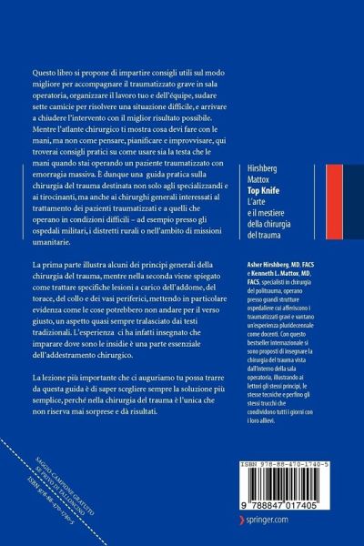 Questo libro si propone di impartire i consigli utili sul modo migliore per accompagnare il paziente traumatizzato grave in sala operatoria, organizzare il lavoro tuo e dell'équipe, sudare sette camicie per risolvere una situazione difficile, ma alla fine chiudere l'intervento con il miglior risultato possibile. In poche parole, una guida pratica sulla chirurgia del trauma destinata non solo agli specializzandi e ai tirocinanti, ma anche ai chirurghi generali interessati al trattamento dei pazienti traumatizzati e ai chirurghi che operano in condizioni difficili - ad esempio presso gli ospedali militari, i distretti rurali o nell'ambito di missioni umanitarie. Sull'atlante chirurgico impari a utilizzare le mani, ma certo non a ragionare, prevenire le mosse e improvvisare, mentre grazie ai nostri consigli pratici apprenderai che quando operi un paziente traumatizzato con emorragia massiva devi usare la testa, oltre che le mani.