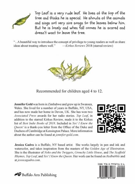 Top Leaf is a very rude leaf. He lives at the top of the tree and thinks he is special. He shouts at the animals and sings not very nice songs to the leaves below him. But he is lonely and when fall comes he is scared and doesn't want to leave the tree. Find out what happens to Top Leaf in this charming story as it cycles through the seasons and ends with friendship and understanding.