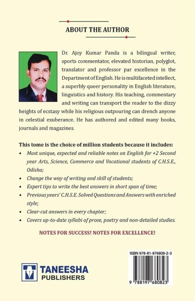 Dr. Ajoy Kumar Panda is a bilingual writer, sports commentator, elevated historian, polyglot, translator and professor par excellence in the Department of English. He is multifaceted intellect, a superbly queer personality in English literature, linguistics and history. His teaching, commentary and writing can transport the reader to the dizzy heights of ecstasy while his religious outpouring can drench anyone in celestial exuberance. He has authored and edited many books, journals and magazines. This tome is the choice of million students because it includes:Most unique, expected and reliable notes on English for +2 Second year Arts, Science, Commerce and Vocational students of C.H.S.E., Odisha; Change the way of writing and skill of students; Expert tips to write the best answers in short span of time; Previous years' C.H.S.E. Solved Questions and Answers with enriched style; Clear-cut answers in every chapter; Covers up-to-date syllabi of prose, poetry and non-detailed studies. NOTES FOR SUCCESS! NOTES FOR EXCELLENCE!