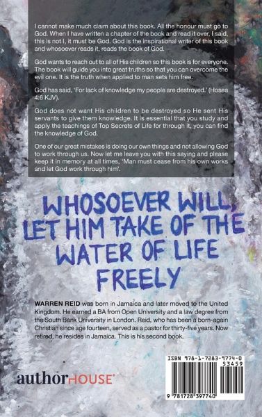 I cannot make much claim about this book. All the honour must go to God. When I have written a chapter of the book and read it over, I said, this is not I, it must be God. God is the inspirational writer of this book and whosoever reads it, reads the book of God. God wants to reach out to all of His children so this book is for everyone. The book will guide you into great truths so that you can overcome the evil one. It is the truth when applied to man sets him free. God has said, 'For lack of knowledge my people are destroyed.' (Hosea 4:6 KJV). God does not want His children to be destroyed so He sent His servants to give them knowledge. It is essential that you study and apply the teachings of Top Secrets of Life for through it, you can find the knowledge of God. One of our great mistakes is doing our own things and not allowing God to work through us. Now let me leave you with this saying and please keep it in memory at all times, 'Man must cease from his own works and let God work through him'.