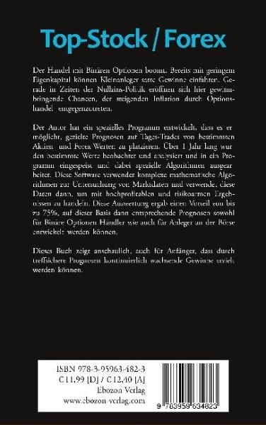 Der Handel mit Binären Optionen boomt. Bereits mit geringem Eigenkapital können Kleinanleger satte Gewinne einfahren. Gerade in Zeiten der Nullzins-Politik eröffnen sich hier gewinnbringende Chancen, der steigenden Inflation durch Optionshandel entgegenzutreten.Der Autor hat ein spezielles Programm entwickelt, dass es ermöglicht, gezielte Prognosen auf Tages-Trades von bestimmten Aktien- und Forex-Werten zu platzieren. Über 1 Jahr lang wurden bestimmte Werte beobachtet und analysiert und in ein Programm eingespeist und dabei spezielle Algorithmen ausgearbeitet. Diese Software verwendet komplexe mathematische Algorithmen zur Untersuchung von Marktdaten und verwendet diese Daten dann, um mit hochprofitablen und risikoarmen Ergebnissen zu handeln. Diese Auswertung ergab einen Vorteil von bis zu 75%, auf dieser Basis dann entsprechende Prognosen sowohl für Binäre Optionen Händler wie auch für Anleger an der Börse entwickelt werden können.Dieses Buch zeigt anschaulich, auch für Anfänger, dass durch treffsichere Prognosen kontinuierlich wachsende Gewinne erzielt werden können.