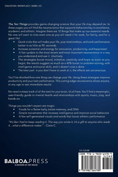 The Ten Things provides game-changing science that your life may depend on. In these pages you will find the neuroscience that supports behaviors key to excellence, academic and athletic. Imagine there are 10 things that make up the essential needs of every single one of us. No one will want to miss even one as you will need it for work, for family, for school, and for a great life! ¿ Quick tricks that will make your life, all your relationships and work performance better in as little as 90 seconds. ¿ Increase potential and energy for innovation, productivity, and happiness! ¿ A fast update to the most recent and most important neuroscience in a way you understand and use it intuitively. ¿ The strategies boost mood, initiative, creativity and hope as soon as you begin; the results suggest as much as a 40% boost to problem-solving, with intelligence and social skills, and it doesn't cost a dime. The best part is you don't have to work at it, the effects are unconscious. You'll be shocked how even one thing can change your life. Using these strategies improve productivity, happiness, and your best performance. This cutting-edge neuroscience allows anyone, at any age to see immediate results. No need to keep track of all the best for your brain, it's packaged all in one place in this book. You'll find a meaningful, user-friendly guide to mental health and relationships with sports, music, play, and hands-on. Things you wouldn't expect are magic: ¿ Foods for a flatter belly and better memory ¿ Simple movements that increase intelligence and improve social behaviors ¿ A few self-generated visuals and words that cause elite, athletic performance "It's like I had to keep reading it. The way you wrote it, it's a gift to anyone who reads it...what a difference maker." Claire C.