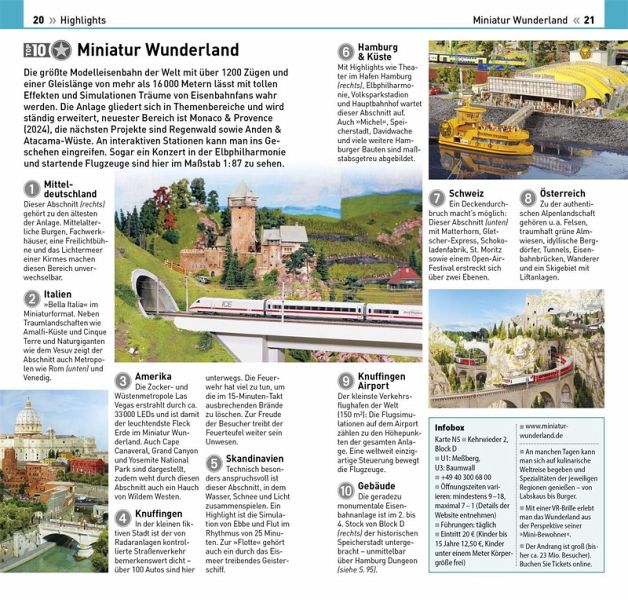 Hamburg in vier Tagen? Oder Hamburg in zwei Tagen? Kein Problem: Wenn Sie nur kurz in der Stadt sind und nichts verpassen möchten, gehört der Top 10 Reiseführer Hamburg definitiv ins Gepäck. In der Rubrik "Highlights" werden Sie auf direktem Weg zu den zehn wichtigsten Sehenswürdigkeiten der Stadt geführt, die jeweils auf einer Doppelseite ausführlich vorgestellt werden: von der Elbphilharmonie über die Speicherstadt bis zur Reeperbahn und Hagenbecks Tierpark. Die Tagestouren-Vorschläge bieten eine hilfreiche Inspiration, damit Sie Ihre Zeit optimal nutzen können. Besonders praktisch: Alle Touren sind bereits auf einer übersichtlichen Karte eingezeichnet.