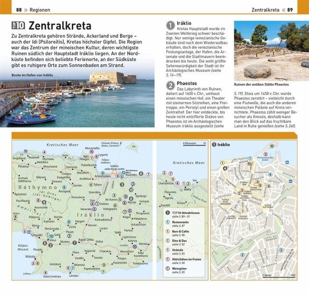 Besuchen Sie die besten Weingüter in Zentralkreta, entspannen Sie an den traumhaftesten Stränden in Westkreta und entdecken Sie die schönsten Fotomotive in Ostkreta - im TOP10 Kreta-Reiseführer werden die einzelnen Regionen Kretas übersichtlich und ausführlich porträtiert. Stimmungsvolle Fotos und detaillierte Regionalkarten zeigen berühmte Sehenswürdigkeiten, charmante Städte und Dörfer sowie Restaurant-, Shopping- oder Tourenvorschläge auf einen Blick.