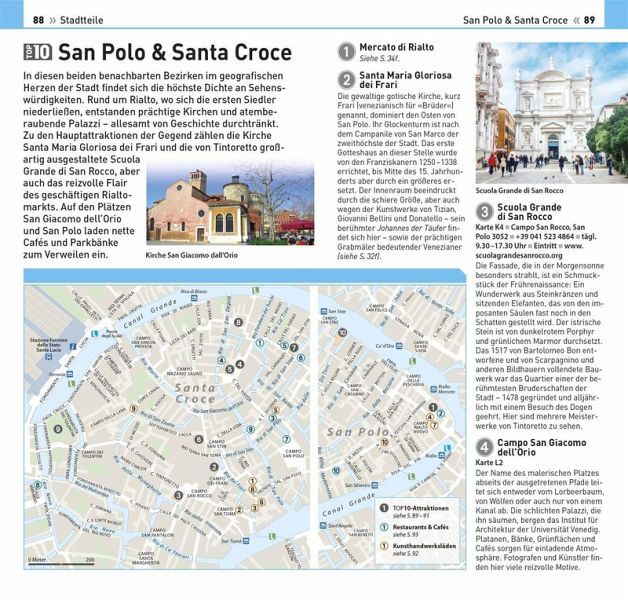 Bestaunen Sie die Dichte an Sehenswürdigkeiten in San Polo & Santa Croce oder machen Sie einen Abstecher nach Padua, Vicenza & Verona - im TOP10 Venedig-Reiseführer werden die einzelnen Stadtteile und die Umgebung Venedigs übersichtlich und ausführlich porträtiert. Stimmungsvolle Fotos und detaillierte Stadtteil-Karten zeigen berühmte Sehenswürdigkeiten, charmante Stadtviertel sowie Restaurant-, Shopping- oder Tourenvorschläge auf einen Blick.