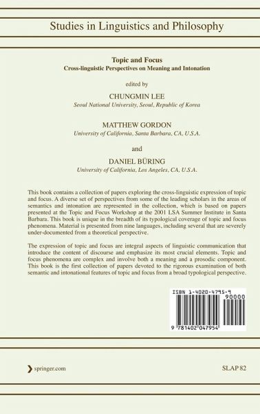 During the 2001 Linguistic Summer Institute at University of California, Santa Barbara, a group of linguists gathered at a workshop to discuss the expression and role of topicalization and focus from a variety of perspectives: phonetic, phonological, syntactic, semantic, and pragmatic. The workshop was designed to lay the groundwork for collaborative efforts between linguists devoted to the study of meaning and linguists engaged in the quantitative study of intonation. This volume contains papers emerging from the Santa Barbara Workshop on Topic and Focus. A wide variety of methodologies and research interests related to topic and focus are represented in the papers. Some works present results of phonetic studies, either acoustic or perceptual, on the expression of topic and/or focus; others examine semantic or pragmatic features of topic and/or focus, while others are concerned with the interface between intonation and meaning. Data from several different languages are represented in the papers, including several languages with relatively little documentation particularly in the venue of topic and focus, e. g. Basque, Chickasaw, Indonesian, Polish, Taiwanese. The broad sample of languages coupled with the wide variety of research topics addressed by the papers promise to enrich our typological understanding of topic and focus phenomena and provide an impetus for further research. The following paragraphs offer brief summaries of the papers contained in this volume: Gorka Elordieta's paper describes prosodic conditions governing focus in a dialect of Basque with pitch accents.