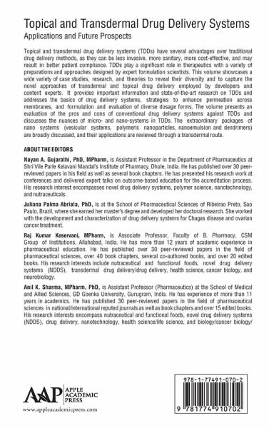 Nayan A. Gujarathi, PhD, MPharm, is Assistant Professor at the Department of Pharmaceutics, Shri Vile Parle Kelavani Mandal's Institute of Pharmacy, Dhule, India. He has 13 years of academic experience in pharmaceutical science. He has published over 30 peer-reviewed papers in the field of pharmaceutical sciences in national and international journals as well as several book chapters. He has presented his research work at an international conference organized by the Controlled Release Society and delivered several expert talks on outcome-based education for the accreditation process. His research interest encompasses novel drug delivery systems, polymer science, nanotechnology, and nutraceuticals. Juliana Palma Abriata, PhD, is at the School of Pharmaceutical Sciences of Ribeirao Preto, Sao Paulo, Brazil, where she earned her master's degree as well as developed her doctoral research. She worked with the development and characterization of drug delivery systems for Chagas disease and ovarian cancer treatment. She was a guest PhD student at the College of Pharmacy, Ohio State University, USA, under the supervision of Dr. Robert Lee. She has published in the drug delivery field. Raj Kumar Keservani, MPharm, is a Faculty of B. Pharmacy, CSM Group of Institutions, Allahabad, India. He has more than 12 years of academic (teaching) experience at various institutes of India in pharmaceutical education. He has published 30 peer-reviewed papers in the field of pharmaceutical sciences in national and international journals, 15 book chapters, three co-authored books, and 12 edited books. He is also active as a reviewer for several international scientific journals. His research interests include nutraceutical and functional foods, novel drug delivery systems (NDDS), transdermal drug delivery/drug delivery, health science, cancer biology, and neurobiology. Anil Kumar Sharma, PhD, MPharm, is an expert in the area of pharmaceutics with a background in drug delivery. He has taught these subjects for nearly 10 years at universities such as the Delhi Institute of Pharmaceutical Sciences and Research, University of Delhi, and School of Medical and Allied Sciences, G D Goenka University, India. Prior to taking up his current role in 2018, Dr. Sharma served in academic positions such as Lecturer (Pharmaceutics), Delhi Institute of Pharmaceutical Sciences and Research, University of Delhi, India. He has published over 28 peer-reviewed papers in the field of pharmaceutical sciences in both national and international journals as well many book chapters and several edited books.