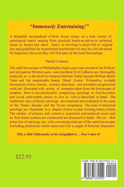 Topics in Astrology is a delightful smorgasbord of three dozen essays on a wide variety of astrological topics ranging from practical, hands-on advice to technical issues to humor and satire. Topics in Astrology is chock-full of original tips and guidelines for experienced practitioners (it may be a bit advanced for beginners; but even they will find parts of the book fascinating). Contents: Natal Astrology, Relationships, Transits, Progressions and Directions, Horary and Electional Astrology, Mundane Astrology, Mayan Astrology, Theory.
