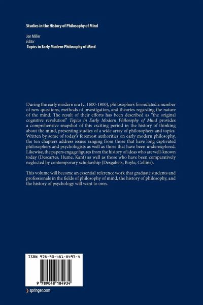 During the early modern era (c. 1600-1800), philosophers formulated a number of new questions, methods of investigation, and theories regarding the nature of the mind. The result of their efforts has been described as "the original cognitive revolution". Topics in Early Modern Philosophy of Mind provides a comprehensive snapshot of this exciting period in the history of thinking about the mind, presenting studies of a wide array of philosophers and topics. Written by some of today's foremost authorities on early modern philosophy, the ten chapters address issues ranging from those that have long captivated philosophers and psychologists as well as those that have been underexplored. Likewise, the papers engage figures from the history of ideas who are well-known today (Descartes, Hume, Kant) as well as those who have been comparatively neglected by contemporary scholarship (Desgabets, Boyle, Collins).
