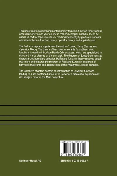 These notes are based on lectures given at the University of Virginia over the past twenty years. They may be viewed as a course in function theory for nonspecialists. Chapters 1-6 give the function-theoretic background to Hardy Classes and Operator Theory, Oxford Mathematical Monographs, Oxford University Press, New York, 1985. These chapters were written first, and they were origi nally intended to be a part of that book. Half-plane function theory continues to be useful for applications and is a focal point in our account (Chapters 5 and 6). The theory of Hardy and Nevanlinna classes is derived from proper ties of harmonic majorants of subharmonic functions (Chapters 3 and 4). A selfcontained treatment of harmonic and subharmonic functions is included (Chapters 1 and 2). Chapters 7-9 present concepts from the theory of univalent functions and Loewner families leading to proofs of the Bieberbach, Robertson, and Milin conjectures. Their purpose is to make the work of de Branges accessible to students of operator theory. These chapters are by the second author. There is a high degree of independence in the chapters, allowing the material to be used in a variety of ways. For example, Chapters 5-6 can be studied alone by readers familiar with function theory on the unit disk. Chapters 7-9 have been used as the basis for a one-semester topics course.