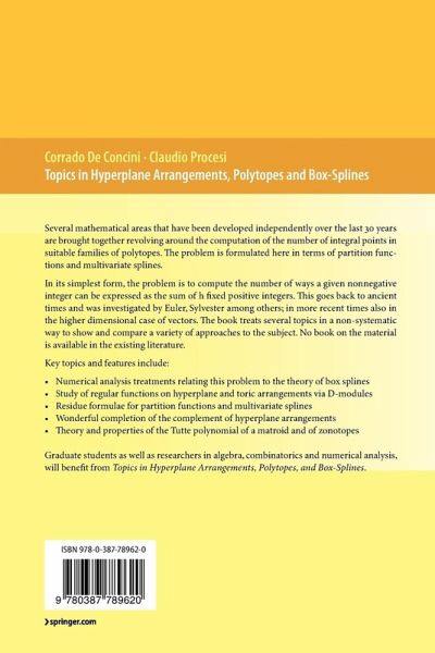Several mathematical areas that have been developed independently over the last 30 years are brought together revolving around the computation of the number of integral points in suitable families of polytopes. The problem is formulated here in terms of partition functions and multivariate splines.In its simplest form, the problem is to compute the number of ways a given nonnegative integer can be expressed as the sum of h fixed positive integers. This goes back to ancient times and was investigated by Euler, Sylvester among others; in more recent times also in the higher dimensional case of vectors. The book treats several topics in a non-systematic way to show and compare a variety of approaches to the subject. No book on the material is available in the existing literature.Key topics and features include:- Numerical analysis treatments relating this problem to the theory of box splines- Study of regular functions on hyperplane and toric arrangements via D-modules- Residue formulae for partition functions and multivariate splines- Wonderful completion of the complement of hyperplane arrangements- Theory and properties of the Tutte polynomial of a matroid and of zonotopesGraduate students as well as researchers in algebra, combinatorics and numerical analysis, will benefit from Topics in Hyperplane Arrangements, Polytopes, and Box Splines.