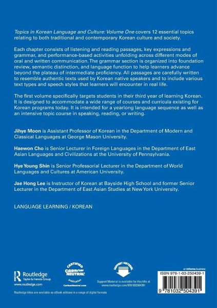 Jihye Moon is Assistant Professor of Korean in the Department of Modern and Classical Languages at George Mason University. Haewon Cho is Senior Lecturer in Foreign Languages in the Department of East Asian Languages and Civilizations at the University of Pennsylvania. Hye Young Shin is Senior Professorial Lecturer in the Department of World Languages and Cultures at American University. Jae Hong Lee is Instructor of Korean at Bayside High School and former Senior Lecturer in the Department of East Asian Studies at New York University.