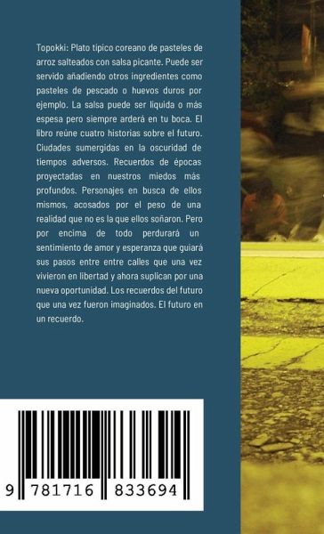 Topokki: Plato típico coreano de pasteles de arroz salteados con salsa picante. Puede ser servido añadiendo otros ingredientes como pasteles de pescado o huevos duros por ejemplo. La salsa puede ser líquida o más espesa pero siempre arderá en tu boca. El libro reúne cuatro historias sobre el futuro. Ciudades sumergidas en la oscuridad de tiempos adversos. Recuerdos de épocas proyectadas en nuestros miedos más profundos. Personajes en busca de ellos mismos, acosados por el peso de una realidad que no es la que ellos soñaron. Pero por encima de todo perdurará un sentimiento de amor y esperanza que guiará sus pasos entre entre calles que una vez vivieron en libertad y ahora suplican por una nueva oportunidad. Los recuerdos del futuro que una vez fueron imaginados. El futuro en un recuerdo.