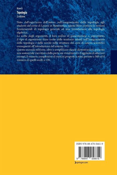 Nato dall'esperienza dell'autore nell'insegnamento della topologia agli studenti del corso di Laurea in Matematica, questo libro contiene le nozioni fondamentali di topologia generale ed una introduzione alla topologia algebrica. La scelta degli argomenti, il loro ordine di presentazione e, soprattutto, il tipo di esposizione tiene conto delle tendenze attuali nell'insegnamento della topologia e delle novita nella struttura dei corsi di Laurea scientifici conseguenti all'introduzione del sistema 3+2. Questa seconda edizione, oltre a semplificare alcune dimostrazioni, presenta una sostanziale riscrittura della parte sui rivestimenti e l'aggiunta di ulteriori esempi; il numero complessivo di esercizi proposti stato portato a 500 ed il numero di quelli svolti a 120.