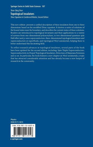 This new edition presents a unified description of these insulators from one to three dimensions based on the modified Dirac equation. It derives a series of solutions of the bound states near the boundary, and describes the current status of these solutions. Readers are introduced to topological invariants and their applications to a variety of systems from one-dimensional polyacetylene, to two-dimensional quantum spin Hall effect and p-wave superconductors, three-dimensional topological insulators and superconductors or superfluids, and topological Weyl semimetals, helping them to better understand this fascinating field.