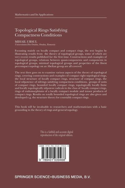 1. Elements of topological groups.- 1. The definition of a topological group.- 2. Neighborhoods of elements of a topological group.- 3. Subgroups of a topological group.- 4. Morphisms and quotients of topological groups.- 5. The axioms of separation in topological groups.- 6. Initial topologies. Products of topological groups.- 7. The co-product topology on the algebraic direct sum.- 8. Semi-direct products of topological groups.- 9. The embedding of totally bounded groups in pseudo-compact ones.- 10. Metrization of topological groups.- 11. The connected component of a topological group.- 12. Quasi-components of topological groups.- 13. Complete topological groups.- 14. Minimal topological groups.- 15. Free topological groups.- 16. The finest precompact topology on an Abelian group.- 17. Ordered topological groups.- 18. Topological groups of the second category.- 19. Inverse limits of topological groups.- 2. Topological rings.- 1. The notion of a topological ring.- 2. Neighborhoods of zero of a topological ring.- 3. Subrings of topological rings.- 4. Compact right topological rings.- 5. The local structure of locally compact rings.- 6. Structure of compact rings.- 7. The separated completion of a topological ring.- 8. Trivial extensions.- 9. Nil and nilpotence in the class of locally compact rings.- 10. The Wedderburn-Mal'cev theorem for compact rings.- 11. Topological products of primary compact rings.- 12. Zero divisors in topological rings.- 13. The group of units of a topological ring.- 14. Boundedness in locally compact rings.- 15. Simple topological rings.- 16. Homological dimension of a compact ring.- 17. Local direct sums of locally compact rings.- 18. Radicals in the class of locally compact rings.- 19. Endc(RM).- 20. Locally compact division rings.- 21.Non-metrizable compact domains.- 22. Open subrings of topological division rings.- 23. Tensor products of compact rings.- 24. Pseudo-compact topologies on the ring of polynomials.- 25. The Lefschetz duality.- 26. The uniqueness of compact ring topologies.- 27. Totally bounded topological rings.- 28. Representations of locally compact rings.- 29. Open questions in topological groups and rings.