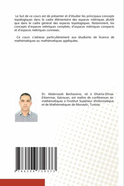 Le but de ce cours est de présenter et d'étudier les principaux concepts topologiques dans le cadre élémentaire des espaces métriques plutôt que dans le cadre général des espaces topologiques. Notamment, les concepts d'espaces métriques complets, d'espaces métriques compacts et d'espaces métriques connexes. Ce cours s'adresse particulièrement aux étudiants de licence de mathématiques ou mathématiques appliquées.