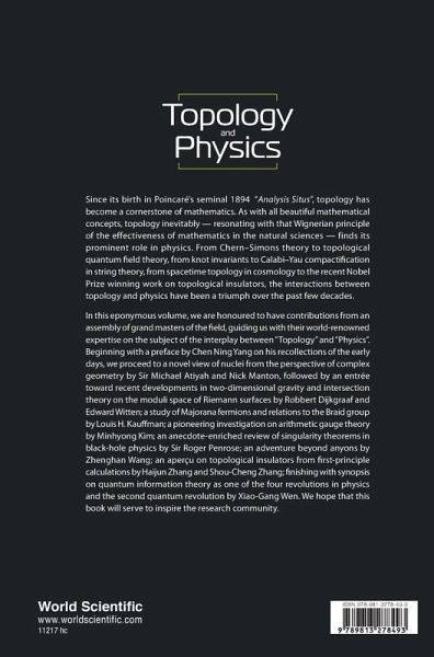 Since its birth in Poincaré's seminal 1894 "Analysis Situs", topology has become a cornerstone of mathematics. As with all beautiful mathematical concepts, topology inevitably — resonating with that Wignerian principle of the effectiveness of mathematics in the natural sciences — finds its prominent role in physics. From Chern–Simons theory to topological quantum field theory, from knot invariants to Calabi–Yau compactification in string theory, from spacetime topology in cosmology to the recent Nobel Prize winning work on topological insulators, the interactions between topology and physics have been a triumph over the past few decades. In this eponymous volume, we are honoured to have contributions from an assembly of grand masters of the field, guiding us with their world-renowned expertise on the subject of the interplay between "Topology" and "Physics". Beginning with a preface by Chen Ning Yang on his recollections of the early days, we proceed to a novel view of nuclei from the perspective of complex geometry by Sir Michael Atiyah and Nick Manton, followed by an entrée toward recent developments in two-dimensional gravity and intersection theory on the moduli space of Riemann surfaces by Robbert Dijkgraaf and Edward Witten; a study of Majorana fermions and relations to the Braid group by Louis H Kauffman; a pioneering investigation on arithmetic gauge theory by Minhyong Kim; an anecdote-enriched review of singularity theorems in black-hole physics by Sir Roger Penrose; an adventure beyond anyons by Zhenghan Wang; an aperçu on topological insulators from first-principle calculations by Haijun Zhang and Shou-Cheng Zhang; finishing with synopsis on quantum information theory as one of the four revolutions in physics and the second quantum revolution by Xiao-Gang Wen. We hope that this book will serve to inspire the research community.