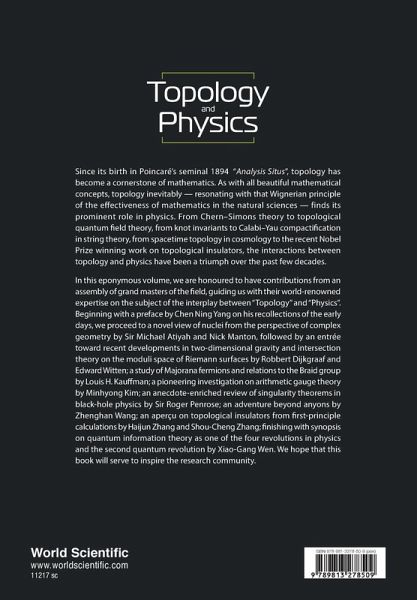 Since its birth in Poincaré's seminal 1894 "Analysis Situs", topology has become a cornerstone of mathematics. As with all beautiful mathematical concepts, topology inevitably — resonating with that Wignerian principle of the effectiveness of mathematics in the natural sciences — finds its prominent role in physics. From Chern–Simons theory to topological quantum field theory, from knot invariants to Calabi–Yau compactification in string theory, from spacetime topology in cosmology to the recent Nobel Prize winning work on topological insulators, the interactions between topology and physics have been a triumph over the past few decades. In this eponymous volume, we are honoured to have contributions from an assembly of grand masters of the field, guiding us with their world-renowned expertise on the subject of the interplay between "Topology" and "Physics". Beginning with a preface by Chen Ning Yang on his recollections of the early days, we proceed to a novel view of nuclei from the perspective of complex geometry by Sir Michael Atiyah and Nick Manton, followed by an entrée toward recent developments in two-dimensional gravity and intersection theory on the moduli space of Riemann surfaces by Robbert Dijkgraaf and Edward Witten; a study of Majorana fermions and relations to the Braid group by Louis H Kauffman; a pioneering investigation on arithmetic gauge theory by Minhyong Kim; an anecdote-enriched review of singularity theorems in black-hole physics by Sir Roger Penrose; an adventure beyond anyons by Zhenghan Wang; an aperçu on topological insulators from first-principle calculations by Haijun Zhang and Shou-Cheng Zhang; finishing with synopsis on quantum information theory as one of the four revolutions in physics and the second quantum revolution by Xiao-Gang Wen. We hope that this book will serve to inspire the research community.